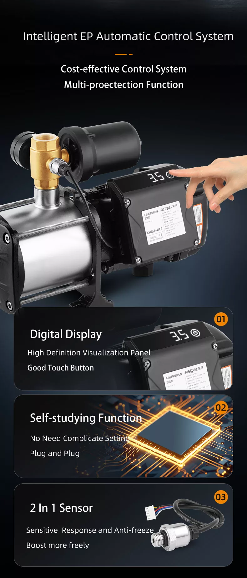 CHM2-6/EP | 0.75 | 4.6 | 60 | 2m³/h@47m | 6 | 383x189x266 | 15.6 |