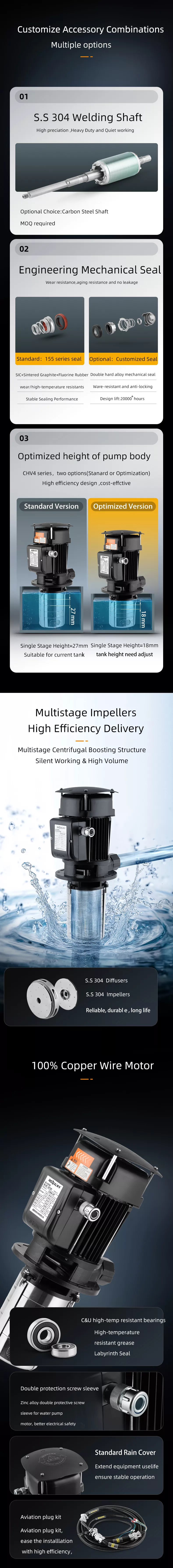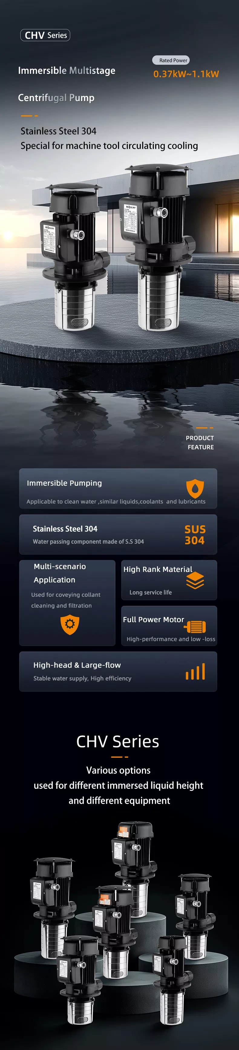 Følgende er en introduksjon av CHV-serien Den nedsenkbare flertrinns sentrifugalpumpen CHV, spesielt designet for pumping av kjølesmøremidler for maskinverktøy, og for å monteres på toppen av tanker med pumpestabelen nedsenket i den pumpede væsken. TRAPPER SBK-pumper er tilgjengelige med forskjellige pumpestørrelser og forskjellige antall trinn for å gi strømningen, trykket og lengden som kreves.